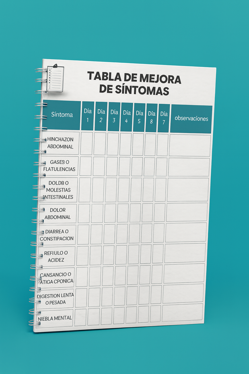 tabla para registrar día a día tus síntomas, sensaciones y progresos digestivos. Te ayuda a tomar conciencia de cómo estás evolucionando y qué alimentos o hábitos te impactan.