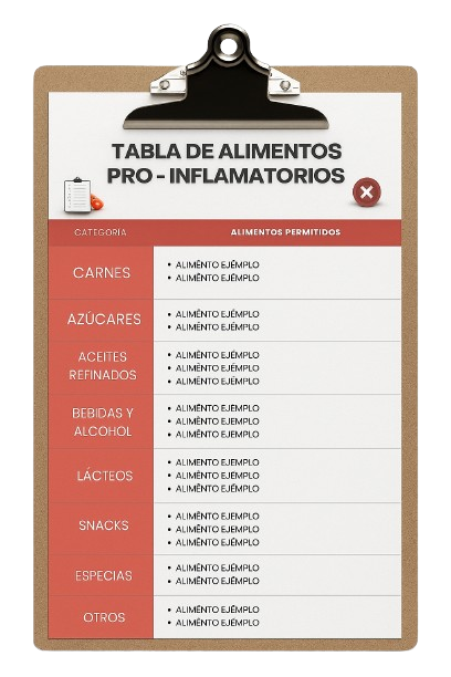 Listado claro de los alimentos que generan inflamación o disbiosis en esta etapa. Te permite evitar errores frecuentes y acelerar tu recuperación.