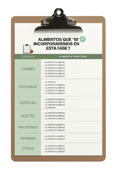 Listado visual y práctico de los alimentos que podés consumir en cada etapa del programa. Reduce la confusión y te guía a elegir con seguridad según tu fase.